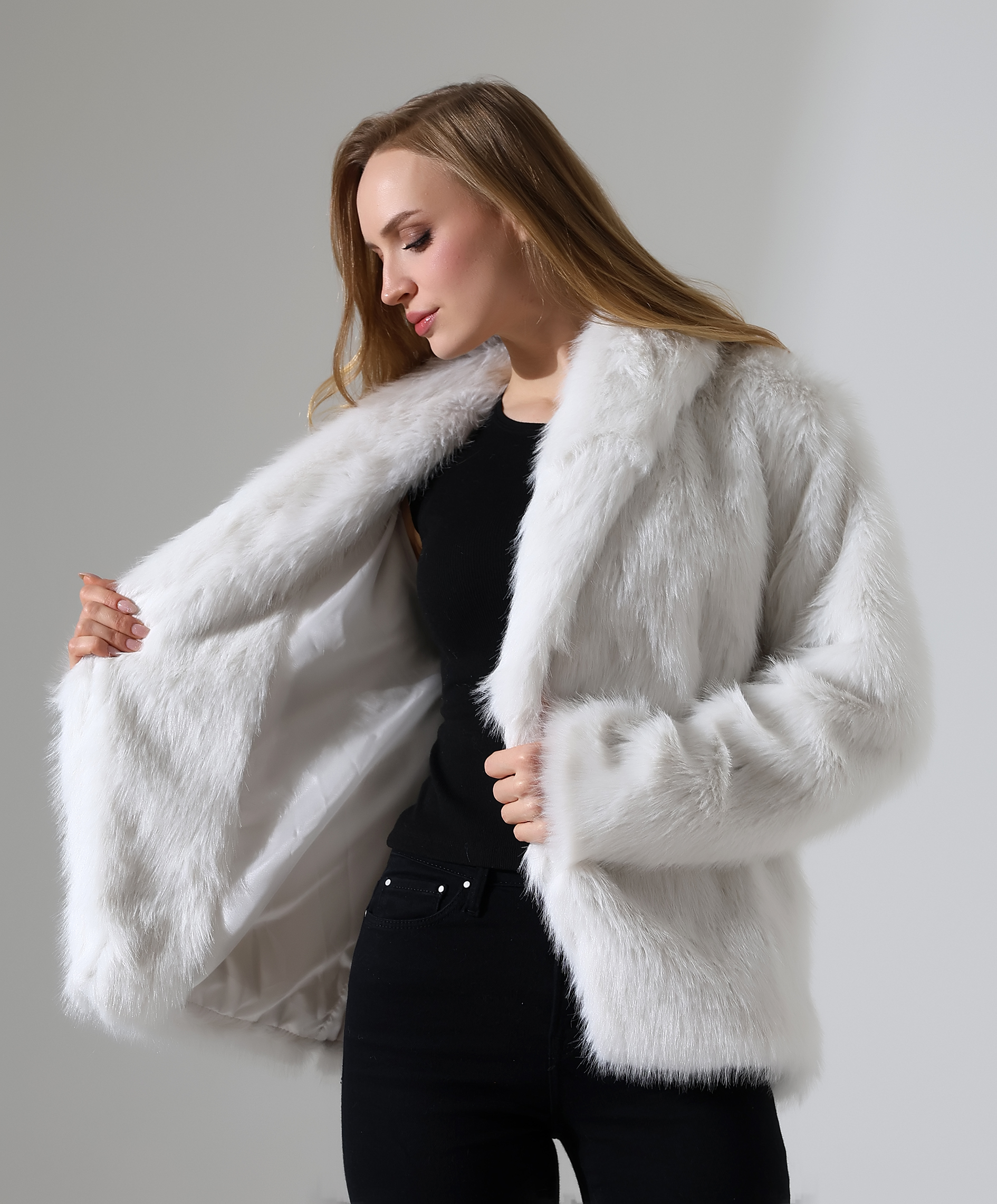 Yumuşak dokusu ve aydınlık beyaz rengiyle öne çıkan bu kürk görünümlü ceket, soğuk günlerde stilinizi kusursuz tamamlar.