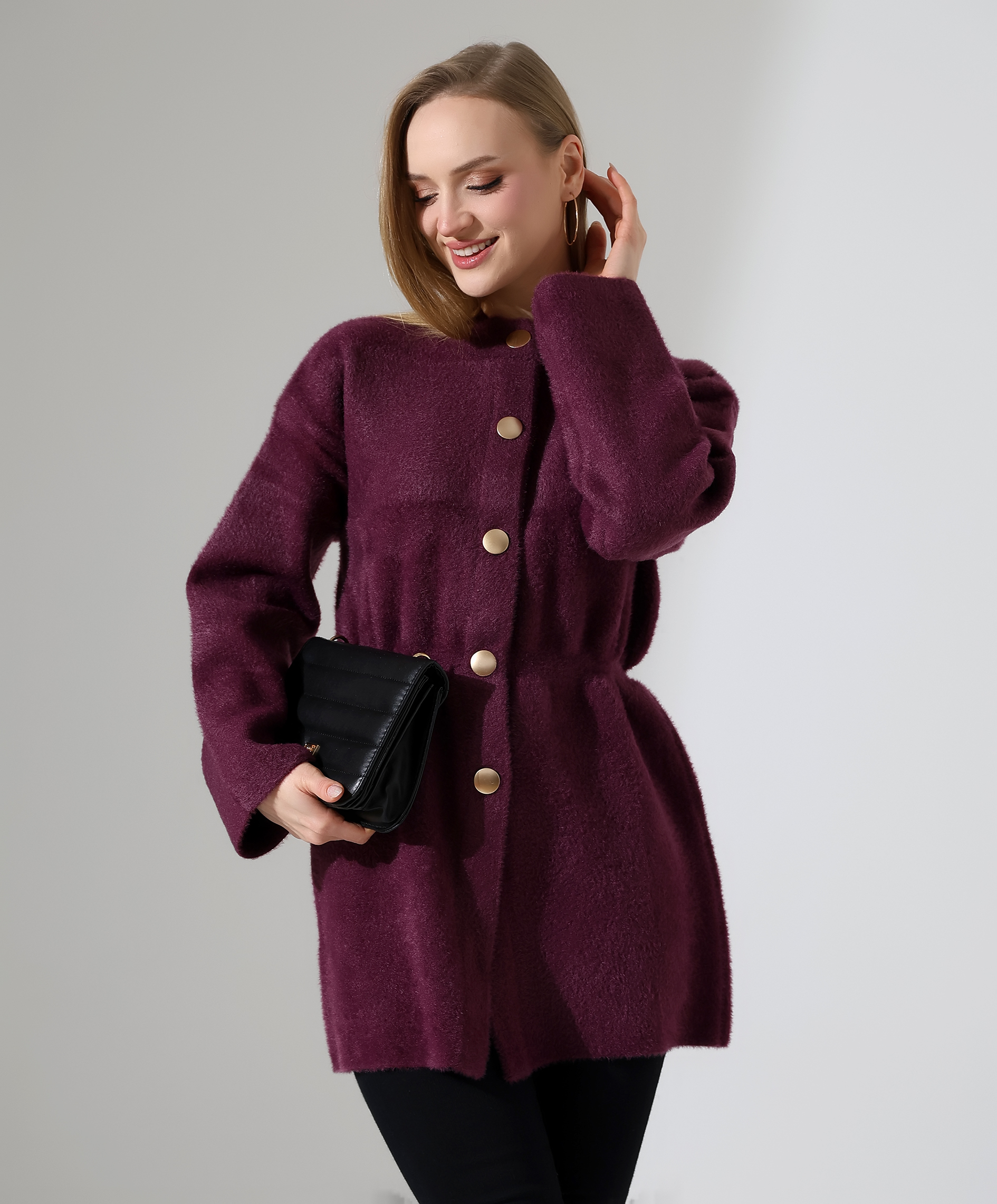 Moxsira Noir Classic gold düğmeli uzun triko ceket. Zamansız, şık ve modern tasarım. Ofis ve şehir kombinleri için ideal.