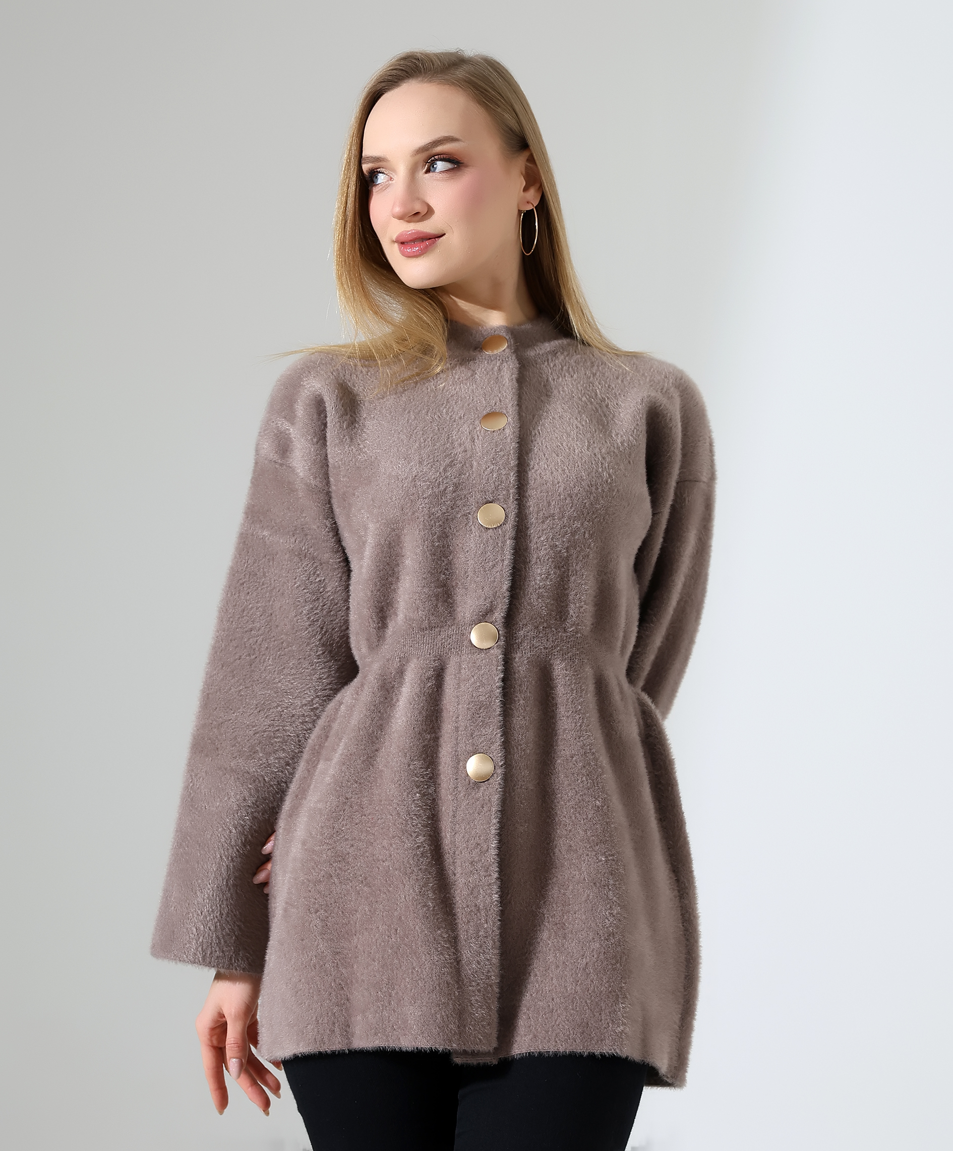 Feminen silueti ve yumuşak dokusuyla öne çıkan Moxsira Soft Taupe Gold Düğmeli Belden Oturan Triko Hırka, zarif ve modern bir duruş sunar. Taupe tonunun doğal ve sıcak görünümü, triko dokunun peluş hissiyle birleşerek premium bir stil algısı yaratır.