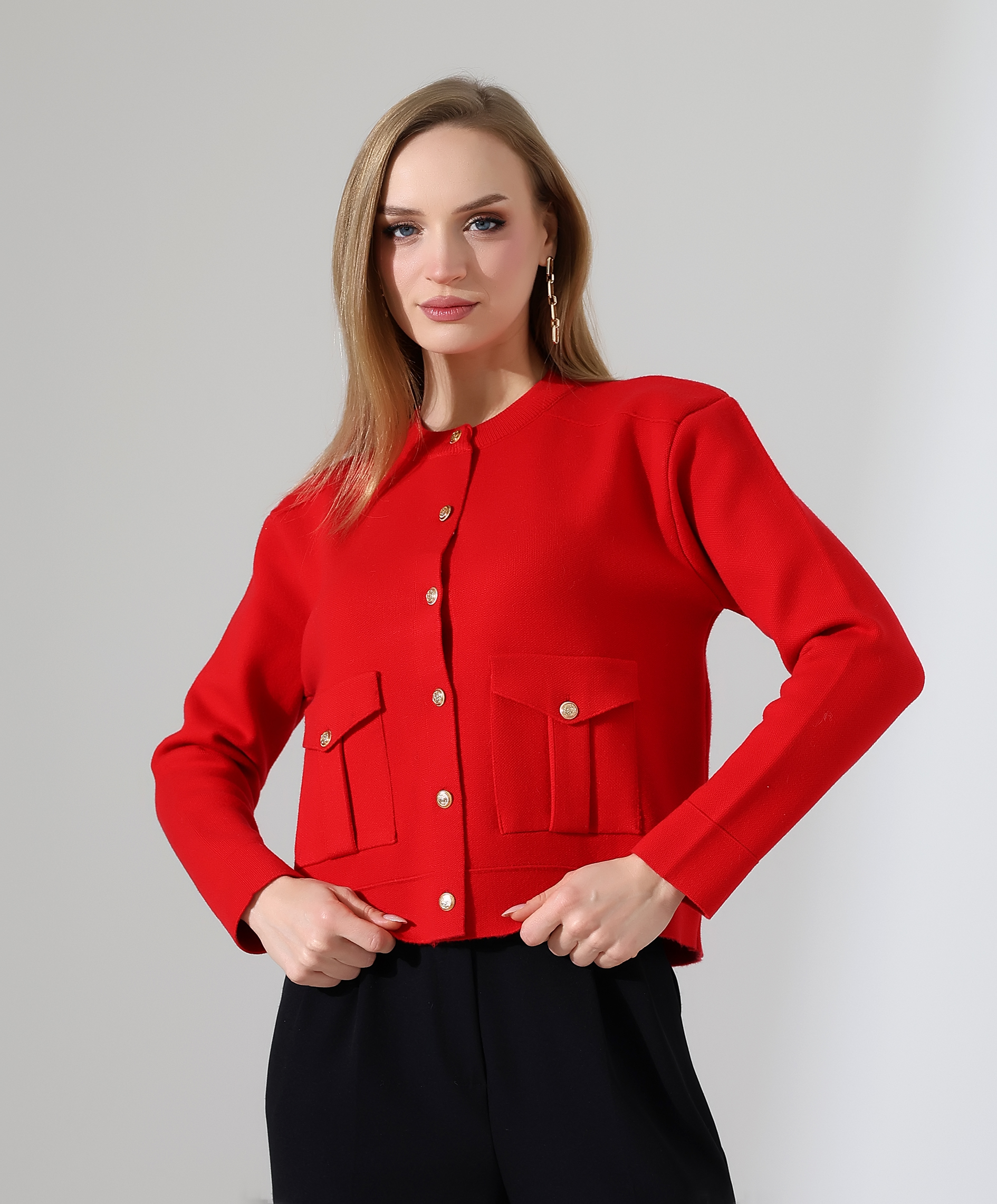 Moxsira Rouge gold düğmeli kırmızı kadın ceket. Şık, modern ve güçlü tasarım. Ofis ve özel kombinler için ideal.